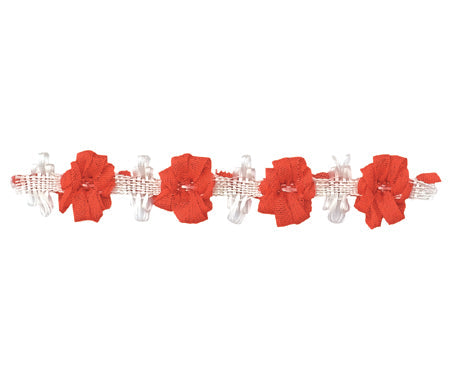 お花をモチーフにしたガーランド(花環)テープです。アクリルタフタリボンで花をイメージしました。ベースは、茎をイメージする緑と、純白なイメージの白の2種類から。またお花はアクリル糸を使用したビビッドな26色からお選び頂けます。オーガンジーを使ったガーランドもあります。